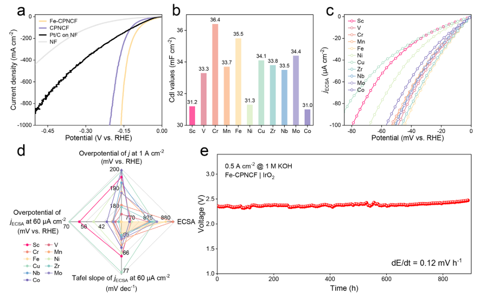 图4:(a)各催化剂的LSV极化曲线;(b)CPNCF与M-CPNCF的双层电容Cdl值;(c)经ECSA归一化的LSV极化曲线及(d)CPNCF与M-CPNCF电化学性能对比;(e)以Fe-CPNCF为阴极、商业IrO2为阳极,在0.5 A cm-2电流密度下的长期稳定性测试。