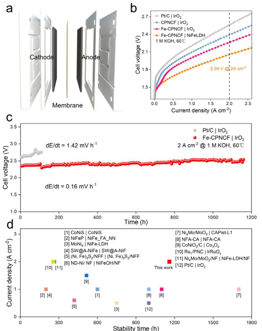 图6:(a)阴离子交换膜水电解器(AEMWE)示意图;(b)AEMWE的LSV极化曲线;(c)不同催化剂在AEMWE中2 A cm-2电流密度下的稳定性对比;(d)Fe-CPNCF与文献报道的先进电催化剂长期稳定性对比。