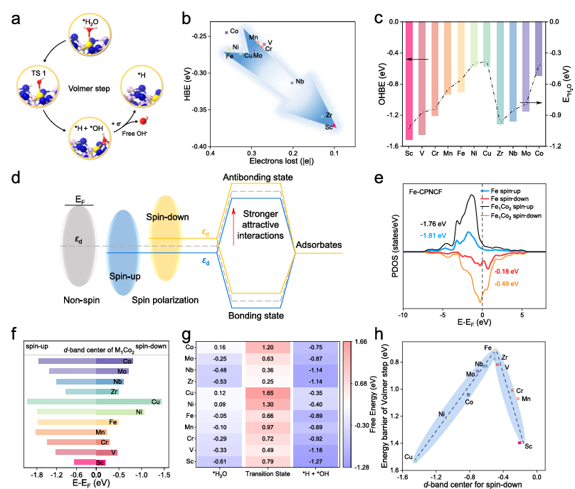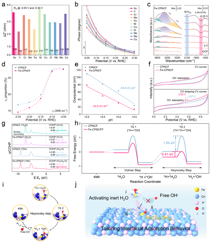 图5:(a)HER中催化剂的电荷转移电阻;(b)对应的Bode相图;(c)Fe-CPNCF表面在HER过程中的原位FTIR光谱;(d)不同电位下ν1峰面积占比;(e)CPNCF与Fe-CPNCF的Pourbaix图;(f)CPNCF与Fe-CPNCF的CV及CO溶出CV曲线;(g)活性位与吸附物的COHP分析;(h)HER过程的吉布斯自由能曲线;(i)M-CPNCF在Heyrovsky步骤的反应机理示意;(j)Fe-CPNCF在HER中的整体机理示意。