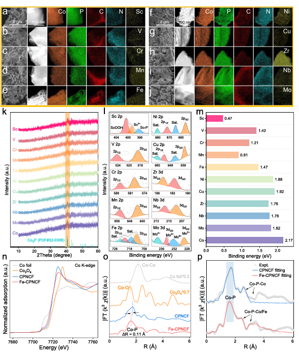 图3:(a–j)M-CPNCF的SEM、STEM及EDS元素分布图;(k)超声处理后粉末的XRD谱图;(l)M-CPNCF中配位金属元素的高分辨XPS光谱;(m)由Tauc图得到的价带顶位置;(n)Co K边XANES光谱;(o)R空间k3加权Co K边FT-EXAFS光谱;(p)CPNCF与Fe-CPNCF的k3加权Co K边EXAFS拟合结果。