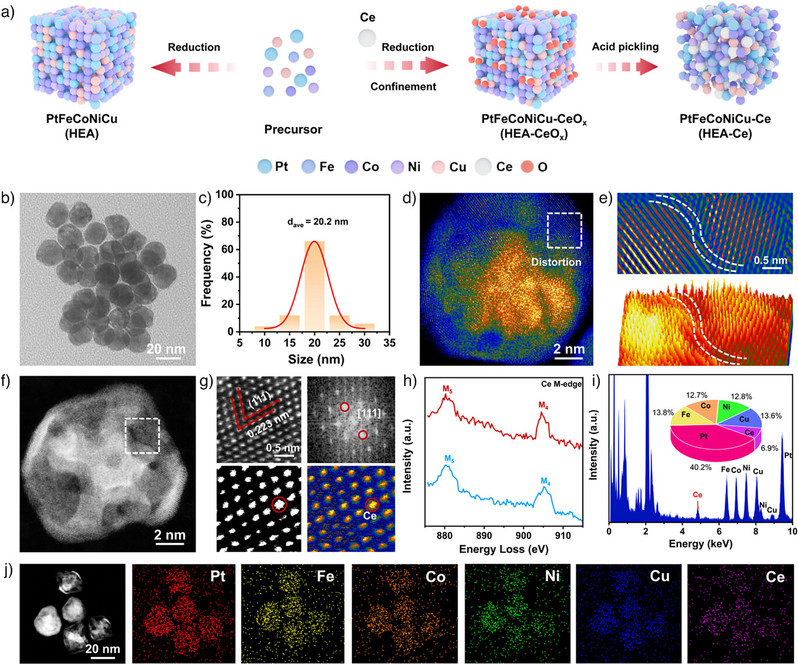 图1:HEA-Ce NC的合成方案和结构表征。a)HEA-Ce的合成方案和一锅共还原形成机制的示意图。b)HEA-Ce的TEM图像和c)尺寸分布图。d)典型HEA-Ce结构的HRTEM图像。e)d)中虚线区域的放大HRTEM图像和相应的3D图,显示晶格畸变。f)典型HEA-Ce结构的HAADF-STEM图像,显示雕刻表面。g)像差校正的HAADF-STEM图像,h)(d)中两个随机区域的Ce M边缘EELS谱。HEA-Ce的EDS元素i)光谱和j)绘图,显示原子比和分布。