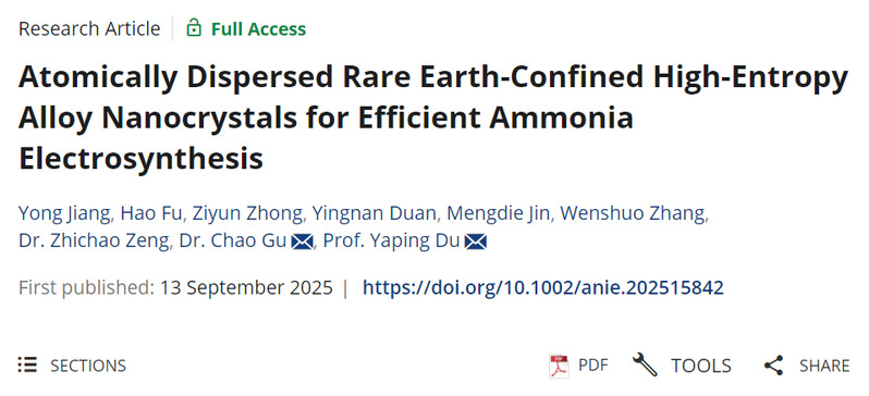 题目:Atomically Dispersed Rare Earth-Confined High-Entropy Alloy Nanocrystals for Efficient Ammonia Electrosynthesis
