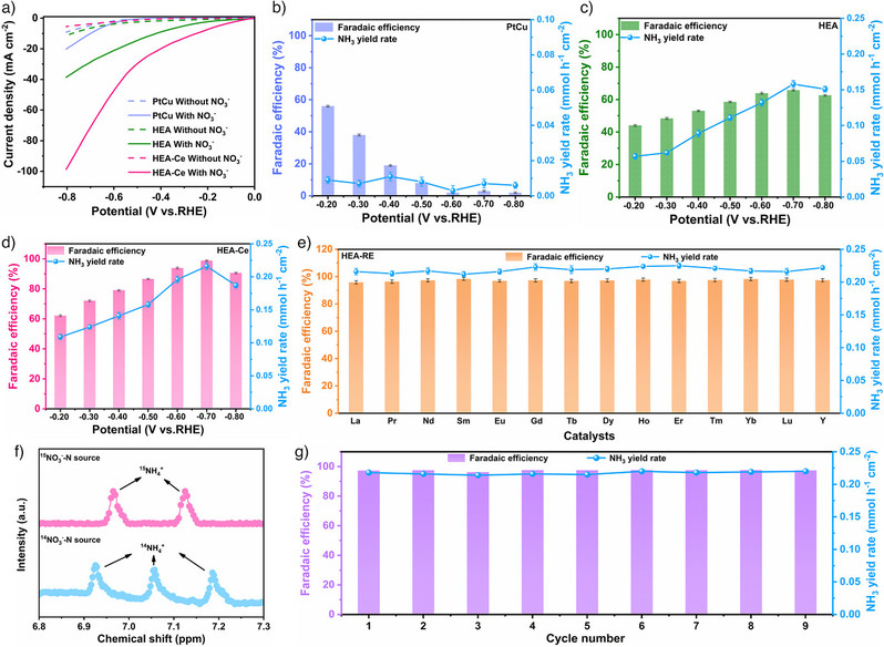 图4:HEA-RE NC和对照样品的电催化NO3RR研究。a)PtCu、HEA和HEA-Ce在相应电解质中的LSV曲线。b)PtCu、c)HEA和d)HEA-Ce的Fe和NH3产率,表明随着元素的逐渐掺入活性增强。e)HEA-RE的Fe和NH3产率(RE=La,Pr,Nd,Sm,Eu,Gd,Tb,Dy,He,Er,Tm,Yb,Lu,Y)表示的稀土元素,f)14NO3−/15NO3−-N源提供的1H NMR谱。g)在-0.7 V下连续运行9个循环进行稳定性测试期间,HEA-Ce的FE和NH3产率。饱和的0.5M K2SO4溶液,含/不含200 ppm KNO3电解质,并将报告的电位转换为RHE。