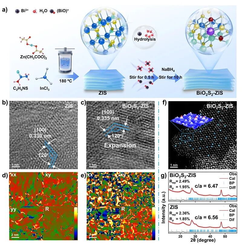 图1. a) BiO2S2-ZIS 制备过程的示意图。b) ZIS 和 c) BiO2S2-ZIS 的高分辨率透射电子显微镜图像。d) ZIS 和 e) BiO2S2-ZIS 的几何相位分析图,每个小图分别代表εxx、εxy、εyy方向和旋转(弧度)的应力分布。比例尺:2 nm。f) BiO2S2-ZIS 的像差校正高角环形暗场扫描透射电子显微镜图像,以及插图中对应区域的3D原子重叠高斯函数拟合图。g) ZIS 和 BiO2S2-ZIS 的 Rietveld 精修 XRD 结果。观测数据、计算线、布拉格位置和差异曲线分别用圆圈、实线、竖条和线条标出。