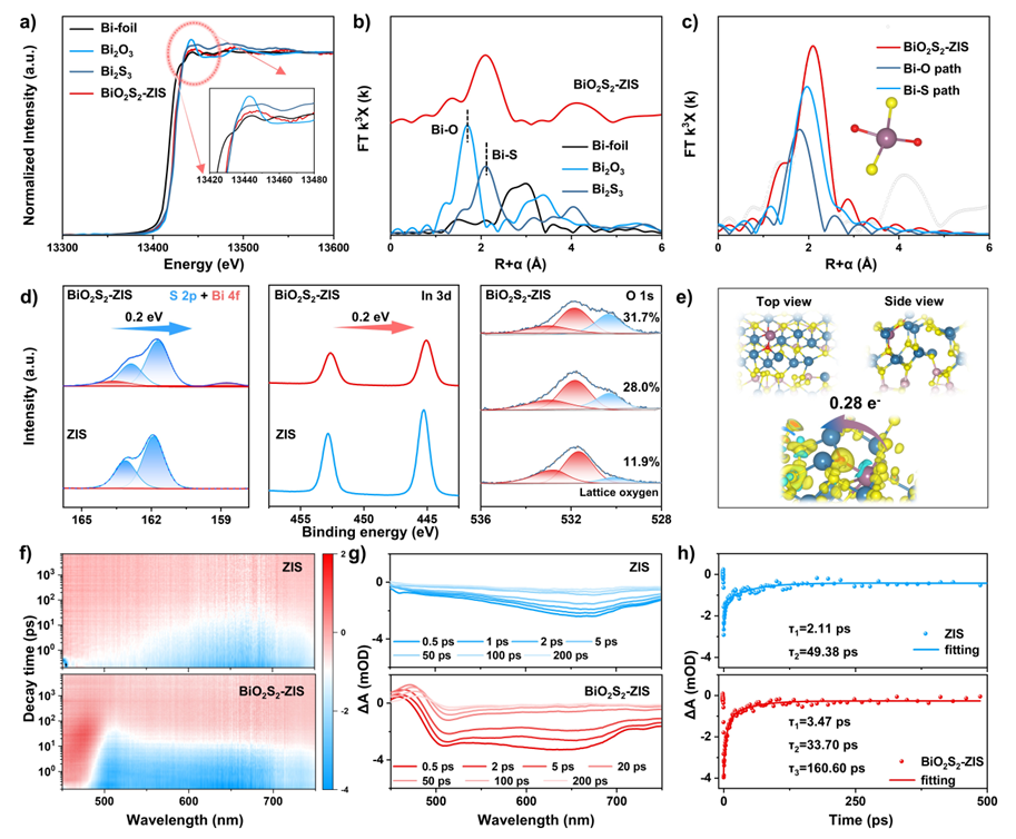 图2. a) 归一化的 Bi L3 边 X 射线吸收近边结构谱。b) BiO2S2-ZIS、Bi 箔、Bi2O3和 Bi2S3 作为参考的 Bi L3 边傅里叶变换扩展 X 射线吸收精细结构谱(R 空间)c) BiO2S2-ZIS 相应的傅里叶变换扩展 X 射线吸收精细结构拟合曲线(插图:BiO2S2位点模型)。d) ZIS 和 BiO2S2-ZIS 的 S 2p、Bi 4f、In 3d X 射线光电子能谱,以及 BiO2S2-ZIS 的 O 1s 刻蚀-XPS 能谱(刻蚀深度从 0 到 2 nm)。e) BiO2S2-ZIS 的理论优化结构模型和电荷密度差分析。f) 伪彩色图。g) 瞬态吸收光谱。h) 为 f) 中的 ZIS 和 BiO2S2-ZIS 拟合的动力学衰减曲线。