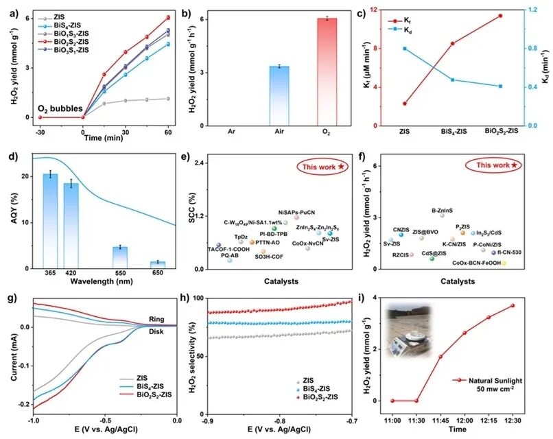 图3. a) ZIS 和 BiOxS4-x-ZIS 的 H2O2产率。b) BiO2S2-ZIS 在不同气氛下的 H2O2产率。c) ZIS、BiS4-ZIS 和 BiO2S2-ZIS 的 H2O2生成速率常数和分解速率常数。d) BiO2S2-ZIS 的波长依赖性表观量子产率。e) BiO2S2-ZIS 与近期报道的光催化剂的太阳能-化学能转换效率比较。f) BiO2S2-ZIS 与近期报道的光催化剂的 H2O2产率比较。g) 在氧气饱和的 0.1 M Na2SO4中、1600 rpm 转速下测得的旋转环盘电极极化曲线(环电流和盘电流)。h) H2O2选择性。i) BiO2S2-ZIS 在室外自然光照射下的性能。