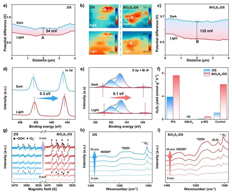图4. a) ZIS 和 c) BiO2S2-ZIS 在光照和黑暗环境下电势差值的分布。b) ZIS 和 BiO2S2-ZIS 在黑暗和光照下的开尔文探针力显微镜图像。d) In 3d 和 e) BiO2S2-ZIS 中 S 2p、Bi 4f 的原位 X 射线光电子能谱。f) 不同反应条件下 H2O2产量的比较。g) ZIS 和 BiO2S2-ZIS 的原位电子顺磁共振谱。h) ZIS 和 i) BiO2S2-ZIS 在光照下的原位漫反射傅里叶变换红外光谱。