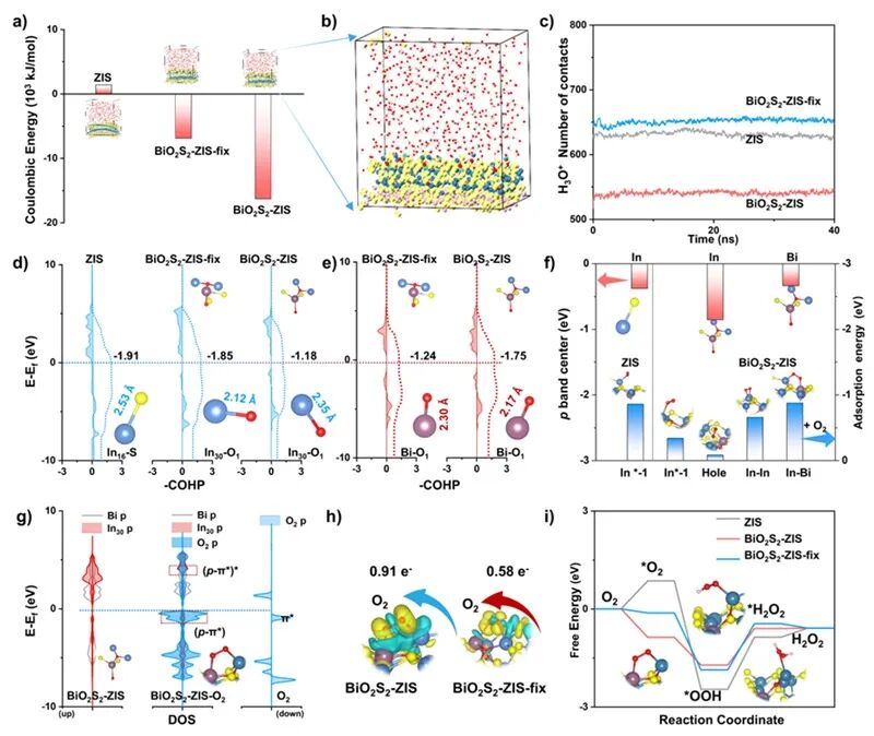 图5. a) H3O+在 ZIS、BiO2S2-ZIS-fix 和 BiO2S2-ZIS 表面分布的示意图(H、Bi、In、Zn、O 和 S 原子分别用白色、紫色、蓝色、粉色、红色和黄色表示)及相应的库仑能量。b) H3O+在 BiO2S2-ZIS 表面分布的放大视图。c) H3O+ 在 ZIS、BiO2S2-ZIS-fix 和 BiO2S2-ZIS 表面接触数的时间演化。d) 不同结构中 In16─S、In30─O1键的晶体轨道哈密顿布居和积分晶体轨道哈密顿布居曲线。e) 不同结构中 Bi─O1键的晶体轨道哈密顿布居和积分晶体轨道哈密顿布居曲线。f) ZIS 和 BiO2S2-ZIS 中不同金属位点的 p 带中心及相应的 O2吸附能。g) O2、BiO2S2-ZIS 和 BiO2S2-ZIS-O2中 Bi、In 和 O 的 p 轨道投影态密度。h) 不同结构与 O2之间的差分电荷密度图和巴德电荷转移。i) 不同催化剂结构上两电子氧还原反应路径的自由能台阶图。