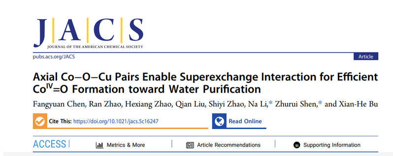 2025年11月8日,南开大学卜显和院士、沈铸睿、李娜团队合作在Journal of the American Chemical Society期刊发表题为“Axial Co-O-Cu Pairs Enable Superexchange Interaction for Efficient Coᴵⱽ=O Formation toward Water Purification”的研究论文,南开大学陈方园为论文第一作者,沈铸睿、李娜为论文共同通讯作者。