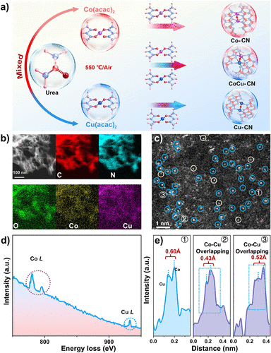 图1. 双原子催化剂的合成与原子尺度表征。(a) CoCu–CN、Co–CN和Cu–CN的合成路线示意图。(b) CoCu–CN的EDS映射图,显示C、N、O、Co和Cu的均匀分布。(c) CoCu–CN的AC-HAADF-STEM图像(双原子和单原子分别用蓝色和浅黄色标记)。(d) 从(c)中双原子位点获取的EELS谱。(e) 对应于(c)中标记位点1–3的强度分布曲线。