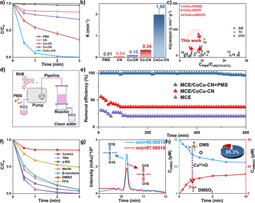 图4. (a, b) 不同催化剂的降解效率和降解反应动力学常数。(c) CoCu–CN与文献中报道的其他催化剂对SIZ、TC和OTC降解速率的比较。(d) 循环稳定性测试装置示意图;(e) 使用循环稳定性装置对RhB的连续去除效率;(f) CoCu–CN/PMS/SIZ体系中的猝灭实验。(g) CoCu–CN活化的PMS体系中DMSO的氧化和DMSO₂的形成。(h) CoCu–CN/PMS体系中DMSO氧化过程中生成的DMSO¹⁶O¹⁶和DMSO¹⁶O¹⁸的提取离子色谱图。反应条件:CSIZ = 5 mg/L, CPMS = 0.1 mM, 催化剂浓度 = 0.05 g/L, 温度 = 298 K, 初始pH = 7。