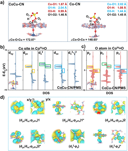 图6. (a) CoCu–CN/PMS和Co–CN/PMS体系中吸附构型的键长分析。(b, c) CoCu–CN中Coᴵⱽ=O物种的Co 3d和O 2p轨道的pDOS。(d) 轨道相互作用后的波函数空间分布。