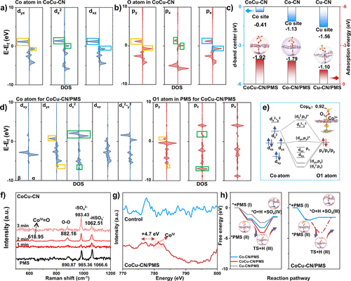 图5. (a, b) CoCu–CN催化结构中Co 3d轨道和O 2p轨道的PDOS。(c) 不同构型中金属位点的d带中心及相应的吸附能。(d) CoCu–CN/PMS吸附构型中Co 3d轨道和O1 2p轨道的PDOS。(e) CoCu–CN中Co 3d轨道与PMS中O 2p轨道之间电子耦合示意图。(f) CoCu–CN/PMS体系的Operando拉曼光谱。(g) CoCu–CN和CoCu–CN/PMS在Co L边的归一化sXAS谱。(h) 沿PMS活化路径形成Coᴵⱽ=O物种的自由能图。