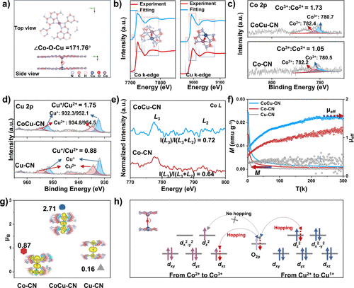 图3. (a) CoCu−CN的DFT优化结构示意图。(b) Co/Cu K边的实验XAFS谱及计算得到的XANES拟合谱。(c, d) 催化剂的Co 2p和Cu 2p XPS谱。(e) 催化剂的Co L边sXAS谱。(f) 催化剂的磁化强度随温度变化曲线及有效磁矩随温度变化曲线。(g) 不同催化结构的磁矩。(h) CoCu−CN结构中超交换模型的示意图。