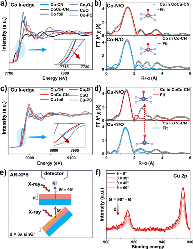 图2. (a, c) 不同样品中Co和Cu的K边XANES谱。插图:谱图的放大区域。(b, d) Co和Cu的EXAFS谱的傅里叶变换幅度。(e) AR-XPS中关于电子出射角的表面成分分布对XPS信号强度影响的示意图。(f) 在不同出射角下收集的CoCu–CN的Cu 2p XPS谱。