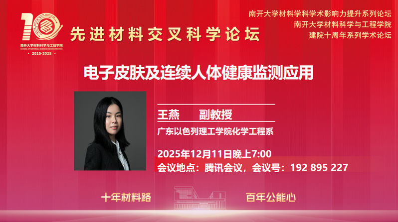 报告人简介:王燕,以色列理工学院中国校区——广东以色列理工学院(GTIIT)化学工程系长聘副教授、独立PI及博士生导师。2021年11月加入该校。她2018年博士毕业于澳大利亚蒙纳士大学,2021年于日本东京大学电子电工系完成博士后研究。在电子皮肤领域,王博士发表论文60余篇,其中以一作/通讯作者身份在Science Advances (3篇), Nature Communications, PNAS, Chemical Society Reviews, and Advanced Materials发表高水平论文40余篇;H指数34,ESI高被引论文5篇;多项澳大利亚/日本/美国/中国专利;入选全球前2%顶尖科学家榜单 (2021-2025)、广东省重大人才工程青年项目(2024)、美国化学会表界面科学女性科学家奖(2025)、英国皇家化学会JMCC期刊新锐科学家(2025)、英国皇家化学会Nanoscale期刊新锐科学家(2022)及国家优秀自费留学生奖学金(2018,全球每年500人)等荣誉。其成果被CNN、Science、澳大利亚《Herald Sun》及日本《日刊工业新闻》等国际知名媒体报道。在GTIIT,王燕课题组致力于柔性材料设计与可穿戴电子开发,推动其在健康医疗及物联网等领域的应用。
