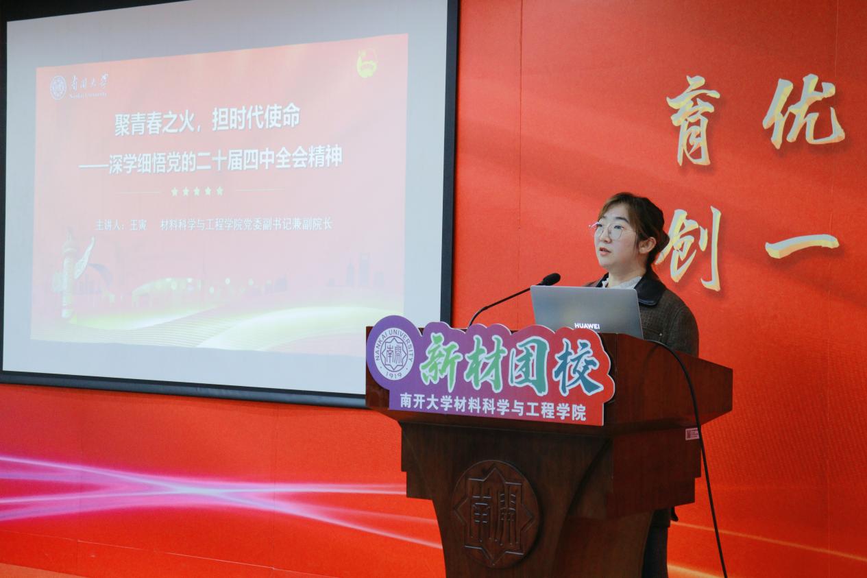 她系统解读道,中国共产党第二十届中央委员会第四次全体会议于2025年10月在北京胜利召开,审议通过了《中共中央关于制定国民经济和社会发展第十五个五年规划的建议》。《建议》系统总结了“十四五”时期发展取得的重大成就,明确了“十五五”时期经济社会发展的指导思想、主要目标和重点任务,为未来五年国家发展擘画了清晰蓝图。她强调青年学子要深刻把握全会核心要义,自觉将个人理想融入国家发展大局,立足材料专业特色夯实学识本领,强化责任担当,以实际行动为实现中华民族伟大复兴的中国梦贡献青春力量。