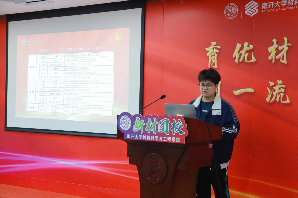 开班仪式在嘹亮的共青团团歌中拉开序幕。团委书记杨晓颖发表开班致辞,向全体学员致以热烈欢迎。她指出,新材团校是材料科学与工程学院团员、团干部的教育和培训中心,是新时代南开共青团切实发挥政治职能,为党和国家培养培育具有南开“公能”品格青年人才的基础阵地。材料科学与工程学院将充分发挥新材团校“团课讲授+能力培养+实践教学”三位一体培养体系,作为为党培养后备军的重要阵地,在青年思想政治引领方面发挥主力军作用。新材团校将引导学生爱国荣校,以爱国、奋斗与青春作南开大学不变的底色,为实现中国式现代化、全面推进中华民族伟大复兴作出应有贡献。