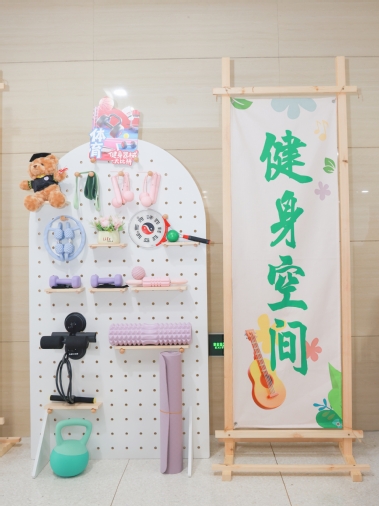 健身空间内,软壶铃、卷腹拉力器、开肩美背带等器材一应俱全,践行“每天锻炼1小时,健康工作50年,幸福生活一辈子”的健康理念,方便师生们科研间隙强健体魄。
