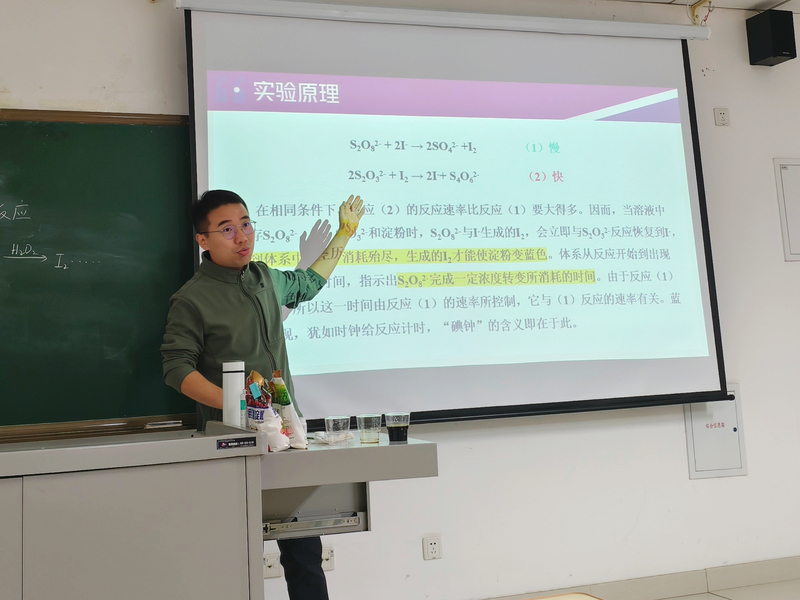 在工科组赛道,来自材料学院、电光学院、环境学院等工科类学院的共9名青年教师报名参赛,评委由来自校内外的5名教学专家组成。倪正民老师以《溶液中的离子反应》实验为题,从国家授时中心的“铯原子钟”讲起,引入到化学实验中的振荡反应典例“碘钟”,开展翻转课堂模式,重点剖析离子反应实验的原理和操作中的重难点,模拟指导实验操作过程,之后进行数据处理,最终获得实验结论。课程紧紧围绕“以学生为中心”,把专业实验与思政教育有机融合,在师生互动中激发学生实验积极性。授课过程得到了评委们的指导与好评。