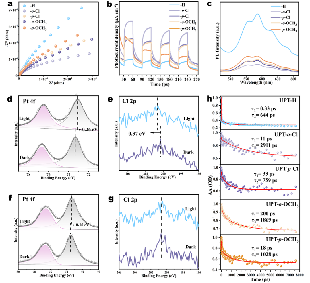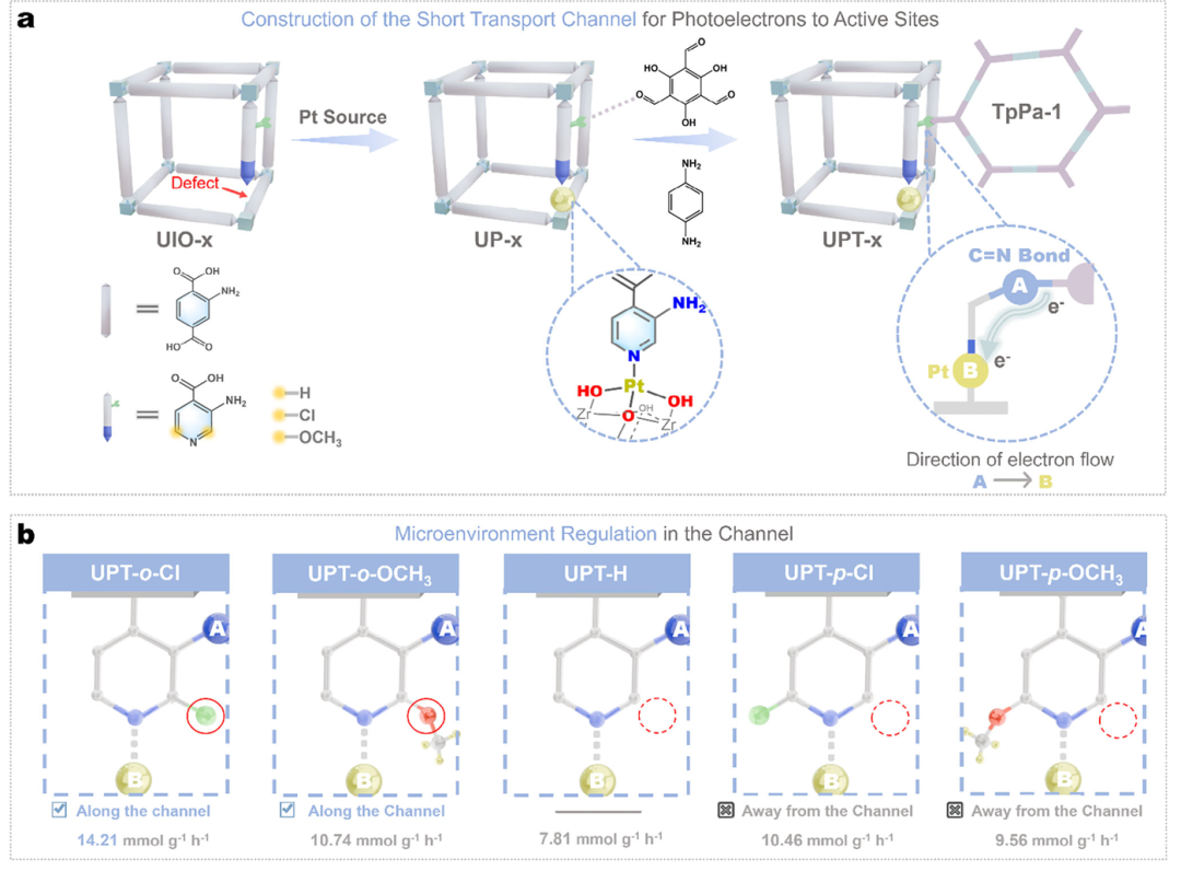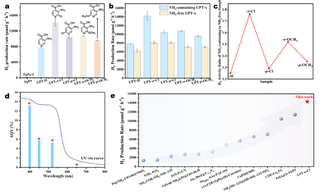 通过在UIO-66-NH₂中引入含氮单齿配体,铂Pt单原子得以同时由氮原子和空位Zr-oxo簇协同锚定。再将含Pt的UIO与TpPa-1进行缩合反应,从而在TpPa与UIO的异质界面处,构建了一条从TpPa到Pt的分子级电子转移通路。通过合理调节单齿配体中官能团(-H、-Cl与-OCH₃)位置,可精确调控在电子通路中的参与程度。当这些基团位于氨基的邻位时,可作为电子中继站,从而促进电子传递。其中,Cl基团表现出比OCH₃更显著的效果,UPT-o-Cl实现了最高的H₂产率,达14.21 mmol·g⁻¹·h⁻¹。