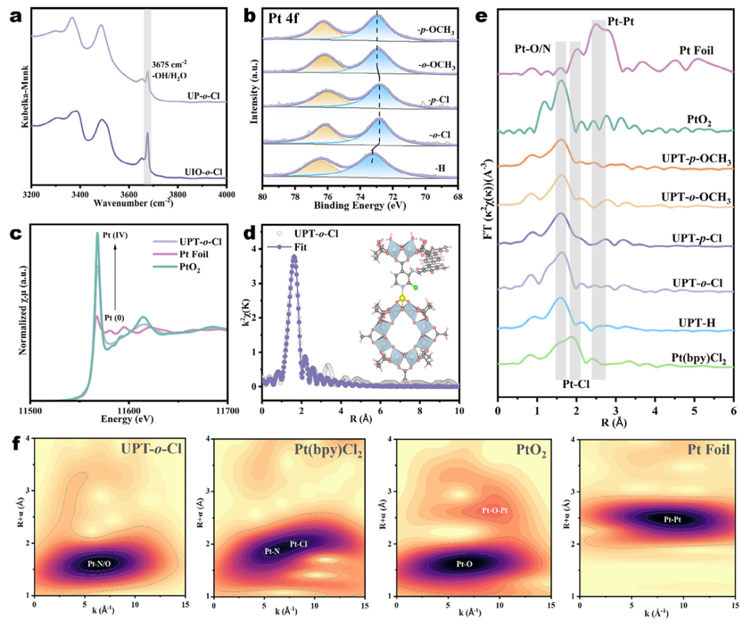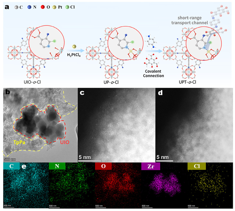 以UIO-66-NH₂(MOF)和TpPa-1(COF)为载体,通过在其界面引入含氮单齿配体(如邻氯苯胺、对甲氧基苯胺等),在Zr-oxo簇和氮原子协同作用下锚定Pt单原子。随后,通过表面氨基与醛基的缩合反应,构建MOF/COF异质结,形成共价连接的电子转移通道。