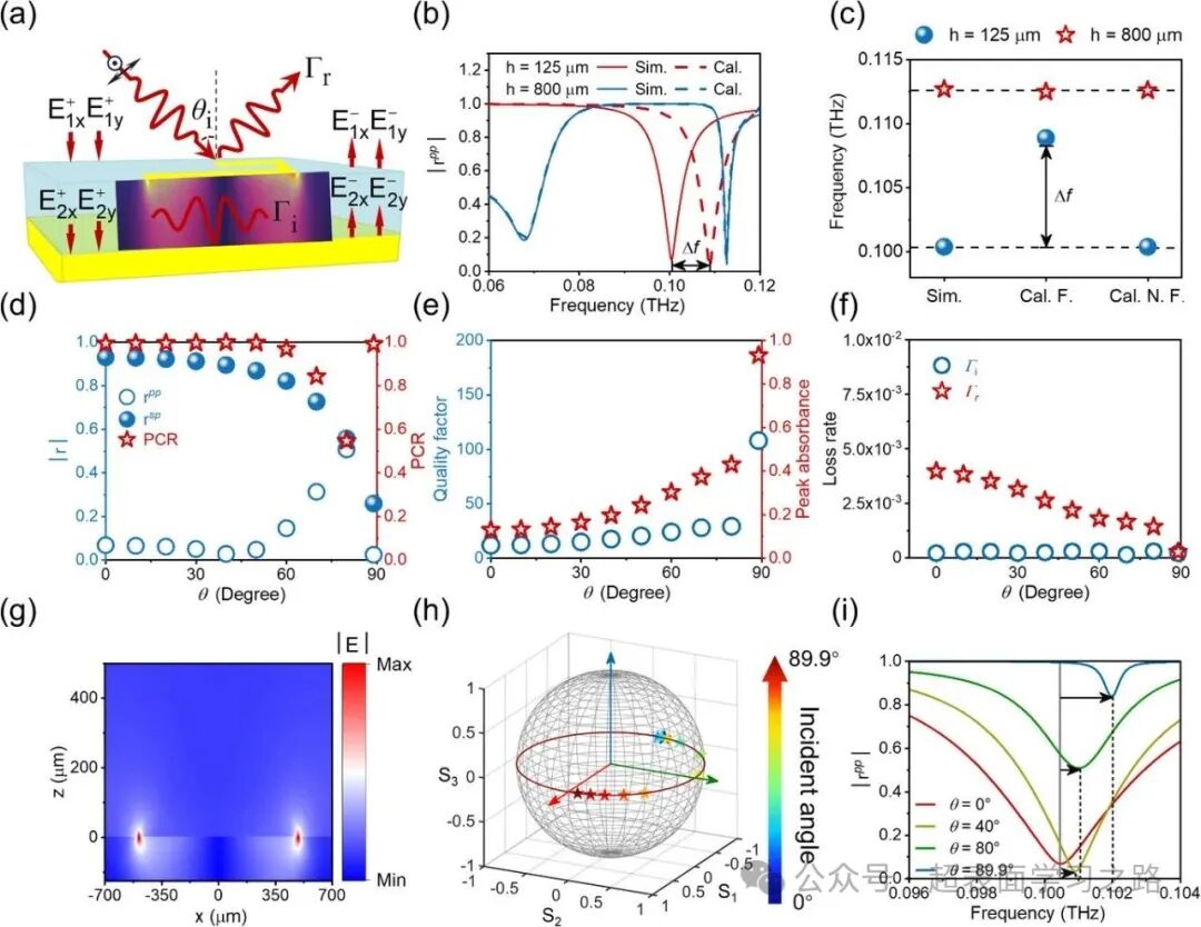 (a)近-远场多波与临界耦合分别在法向入射与掠入射时主导超表面的光学性能。(b)在法向入射、不同基底厚度下,计算得到的远场(Cal. F.)多波模型与仿真反射谱的对比。(c)仿真、Cal. F. 多波模型与计算的近-远场(Cal. N. F.)多波模型之间的共振频率对比。(d)偏振反射谱与偏振转换比(PCR)随入射角变化的关系。(e)不同入射角下超表面的仿真峰值吸收与品质因子(Q)。(f)反演得到的超表面本征损耗率Γi与辐射损耗率Γr。(g)掠入射条件下的计算电场分布。(h)偏振态在庞加莱球上随入射角演化。(i)不同入射角下超表面对p波的反射谱。