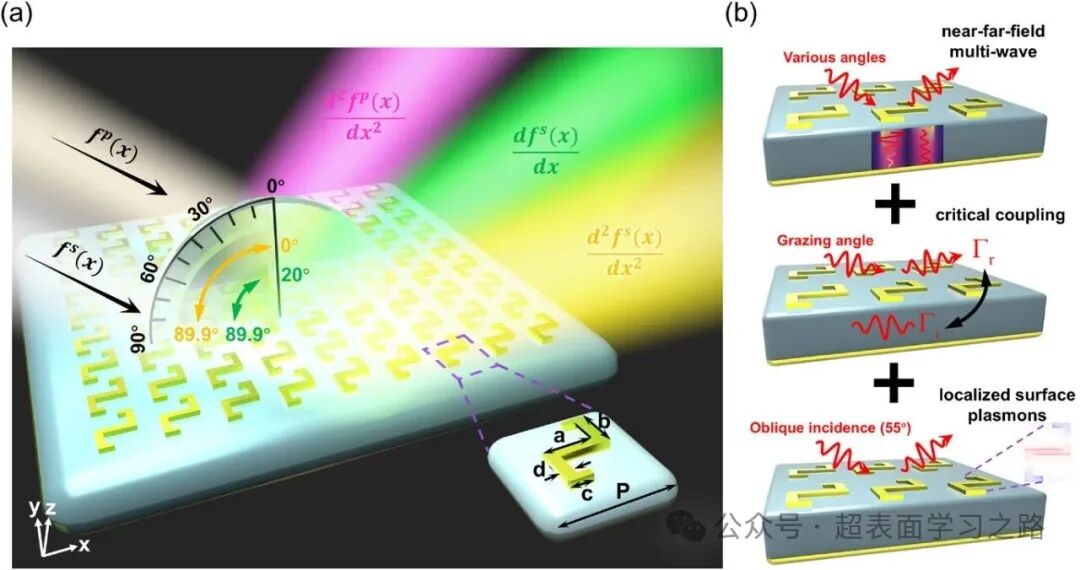 (a)数值模拟表明:在s偏振入射下,微分器可实现一阶与二阶空间微分,其角带宽分别为20°–89.9°与0°–89.9°;在p偏振入射下,微分器实现二阶空间微分,角带宽为0°–89.9°。右下角为所设计微分器的单元结构。(b)临界耦合、近-远场多波干涉以及局域表面等离激元(LSPs)的协同机制,使得能够实现超高NA的一阶/二阶空间模拟微分。