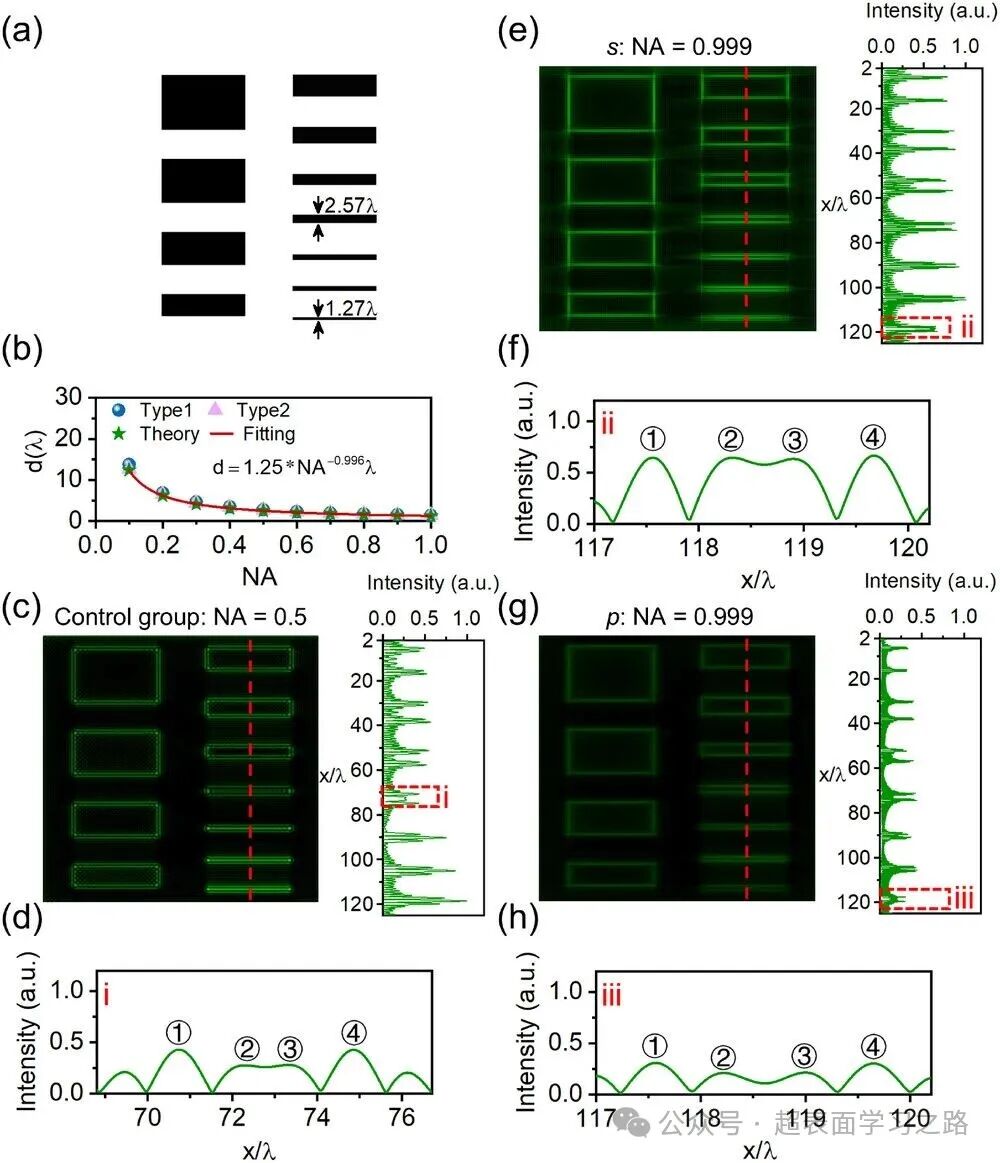 (a)待进行边缘检测的输入物体图像,其线宽范围为1.27λ到25.4λ。(b)所提出的边缘检测分辨极限随NA变化的关系。(c)作为对照组,典型NA=0.5条件下矩形掩膜的计算二阶微分图像;右侧为沿红色虚线的纵向截线强度。(d)对(c)中红色虚线区域i所示二阶微分图像的放大视图。(e,g)在(e)s偏振与(g)p偏振下矩形掩膜的计算微分图像;右侧为沿红色虚线的纵向截线强度。(f,h)分别为(e)中红色虚线区域ii与(g)中红色虚线区域iii所示微分图像的放大视图。