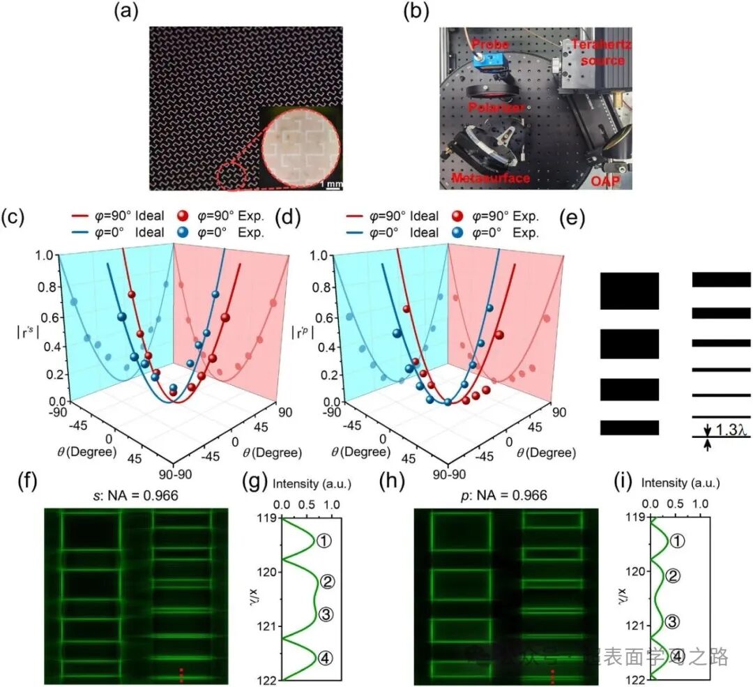 (a)所制备超表面的光学显微镜图像。(b)用于测量超表面传递函数的实验装置。(c,d)在不同入射角下的实验传递函数(虚线)与理想传递函数(实线)对比:分别对应(c)s偏振与(d)p偏振,并沿两条正交方位方向给出。(e)待进行边缘检测的原始图像。(f,h)基于实验反射谱得到的微分图像:分别对应(f)s偏振与(h)p偏振。(g,i)为(f)与(h)中沿红色虚线的微分图像纵向截线强度。