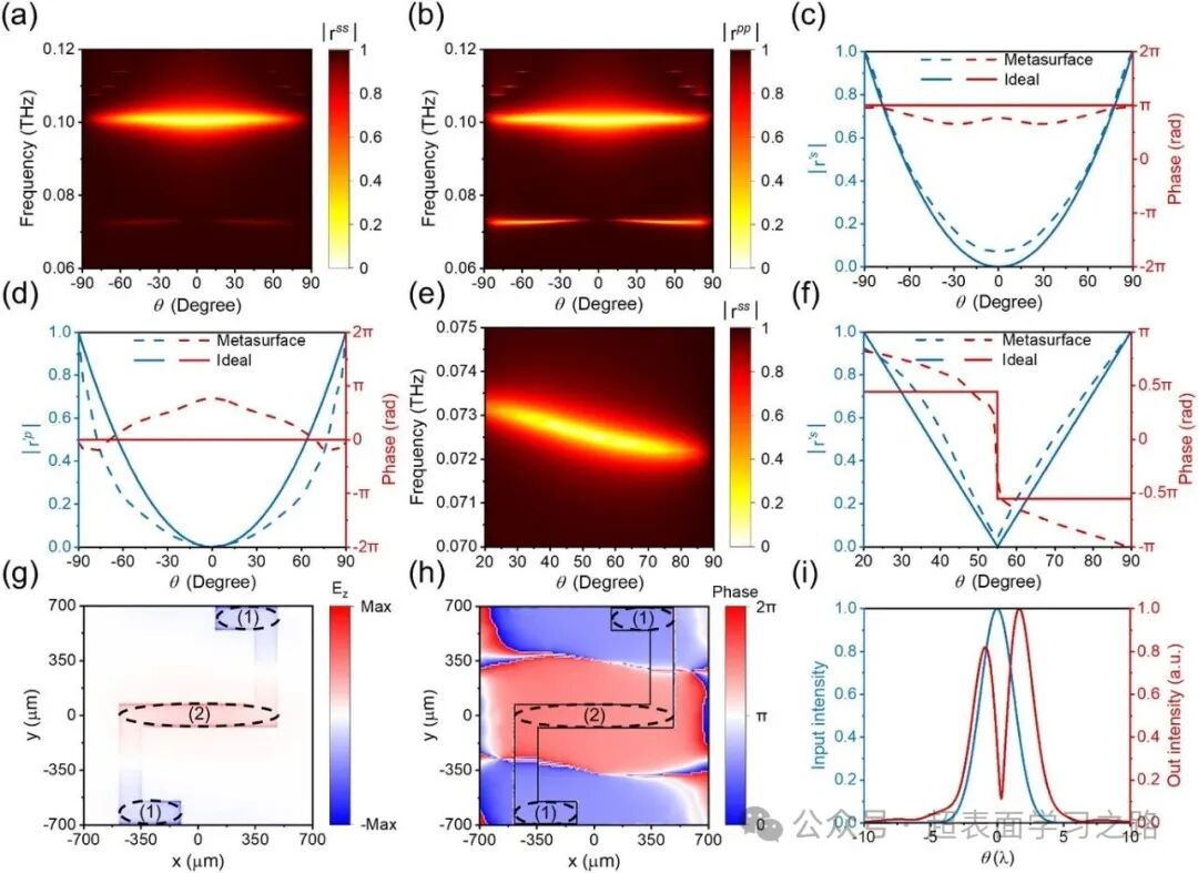 (a,b)在不同入射角下超表面的反射系数幅值:分别对应(a)s偏振与(b)p偏振。(c,d)在0.1004 THz处,不同偏振条件下作为二阶微分器的理想传递函数与仿真传递函数对比。(e)在不同入射角下超表面对s波的反射系数幅值。(f)在0.0725 THz处作为一阶微分器的仿真传递函数与理想传递函数。(g)在入射角55°、频率0.0725 THz下超表面的近场Ez分布;黑色虚线圆表示由于部分对称的超结构导致抑制的LSP共振区域。(h)在入射角55°、频率0.0725 THz下超表面Ez的相位分布。(i)入射高斯光束强度(蓝线)及经超表面处理后对应的一阶微分结果(红线)。