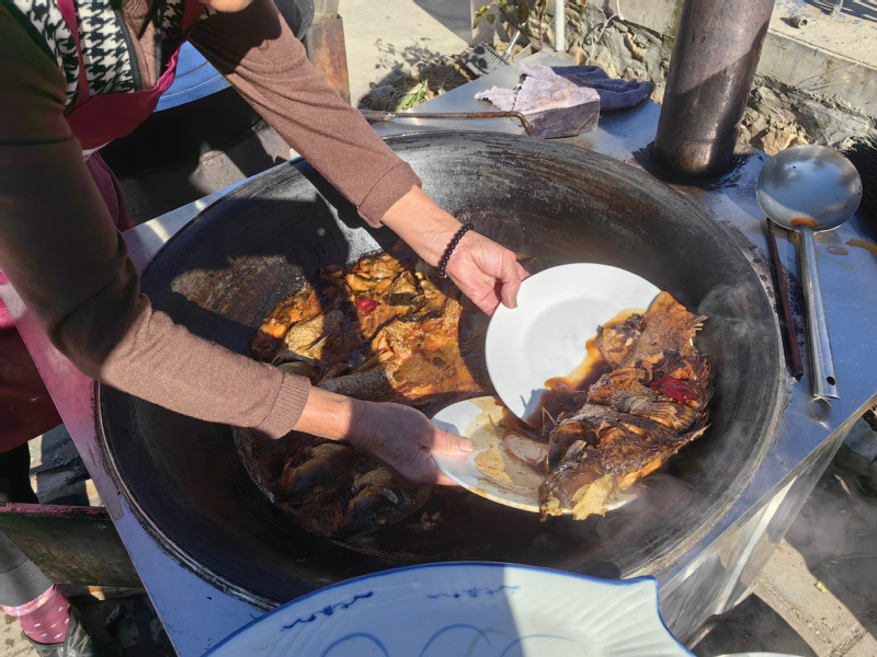 随后,一行人前往桑树庵村农家院,品尝地道“山村大席”。宴席食材均取自本地农田与山林,柴鸡蛋、水库鱼、烀肘子、炒山蘑等十余道农家菜肴鲜香扑鼻,以朴实无华的烹饪手法呈现乡土本味。教职工及家属围坐一堂,在热闹的氛围中共享美食,畅谈生活,进一步增进了彼此的交流与情感。