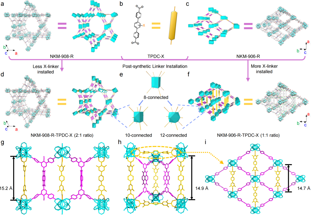 图1 单晶结构和相应的简化单元/拓扑结构(a)R-配体(粉红色原子:简化的R-基团;蓝色框架:NDI核心;粉红色框架:“可修改的外围区域”),(b)NKM-908-OH,(c)Zr6O8节点和(d)NKM-906-H。(e)NKM-908-R内的一种配位不饱和口袋。(f,g)NKM-906-R内的两种配位非饱和口袋。Zr-Zr距离为在减去两端Zr原子的晶体学范德华半径(2.3Å)后测得。