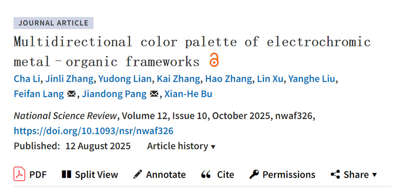 设计稳定且颜色多样可调的电致变色金属-有机框架(MOF)是电致变色商业化的关键。近日,南开大学研究团队利用Zr-MOFs为平台,作为电致变色“调色板”,合成了40种不同的Zr-NDI基MOF作为耐用薄膜,展现出了广泛的颜色变化,提供了简单快捷的电致变色调色策略,为开发实用的定制电致变色MOF材料提供了一种新的解决方案。该成果发表于《国家科学评论》(National Science Review)。南开大学博士研究生李察为该论文的第一作者;庞建东特聘研究员和郎飞帆博士为通讯作者。