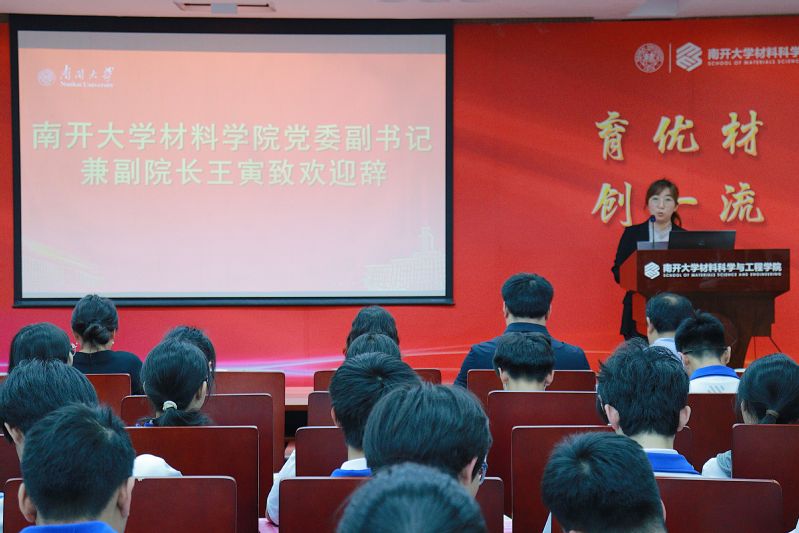 王寅代表学院致欢迎辞,对海河中学师生的到来表示热烈欢迎,介绍了南开材料学科作为国家“双一流”建设学科的发展历程与育人特色,强调高中与高校协同育人的重要意义。