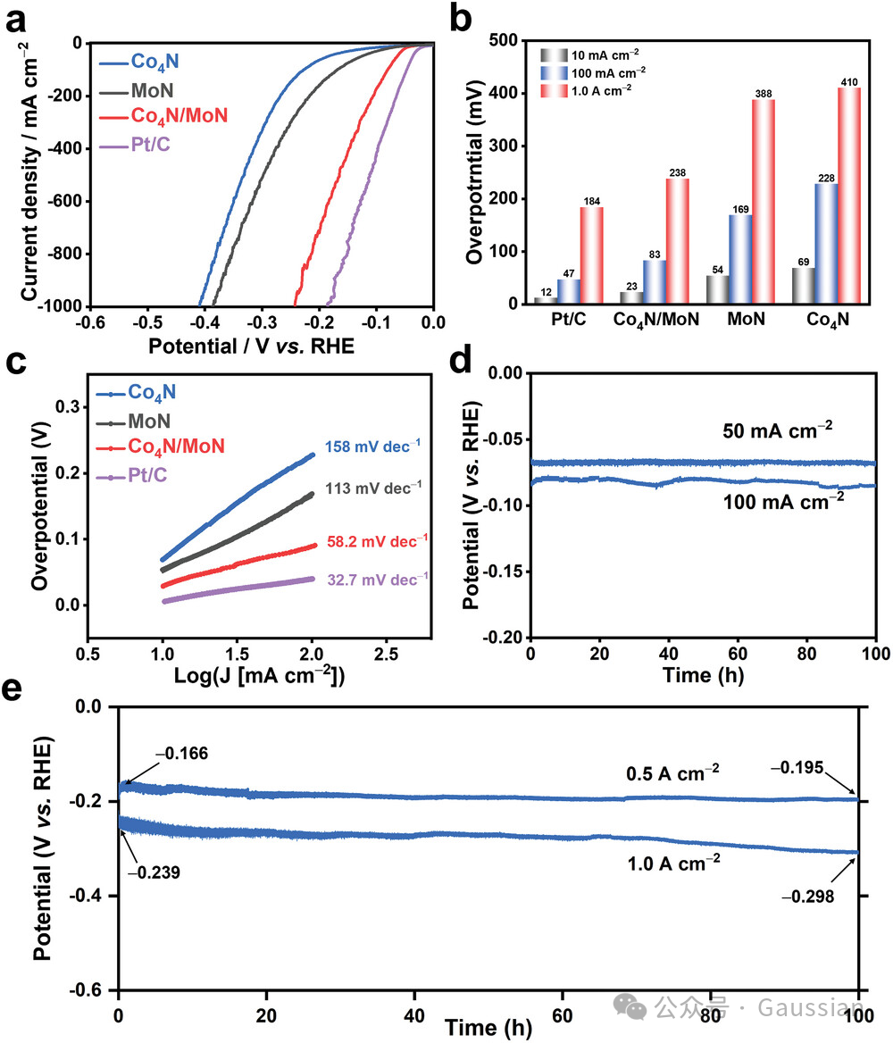 图3. 1.0 M KOH电解液中的电化学性能测试。a)电流密度范围为0-1.0 A cm-2时,扫描速率为1 mV s-1时90% iR补偿的极化曲线;Co4N/MoN、Co4N、MoN和Pt/C样品的b)10 mA cm-2、100 mA cm-2和1.0 A cm-2时的过电位和c)Tafel图。d)Co4N/MoN样品在50和100 mA cm-2的恒定电流密度下的计时电位曲线,iR补偿为90%。e)Co4N/MoN样品在0.5和1.0 A cm-2恒定电流密度和90%iR补偿条件下的计时电位曲线。本研究中的所有电位均转换为可逆氢电极(RHE)。