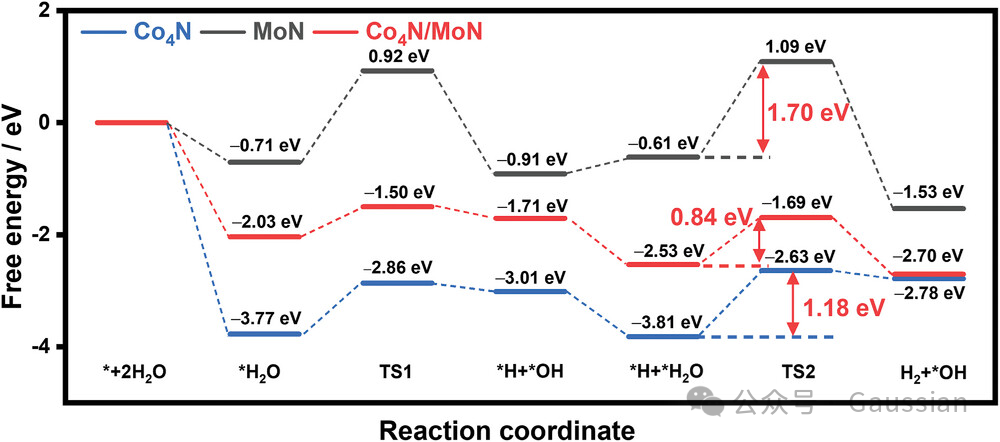 图5.碱性HER在Co4N/MoN、MoN和Co4N模型上的能量曲线。TS:过渡态。*:活性位点。
