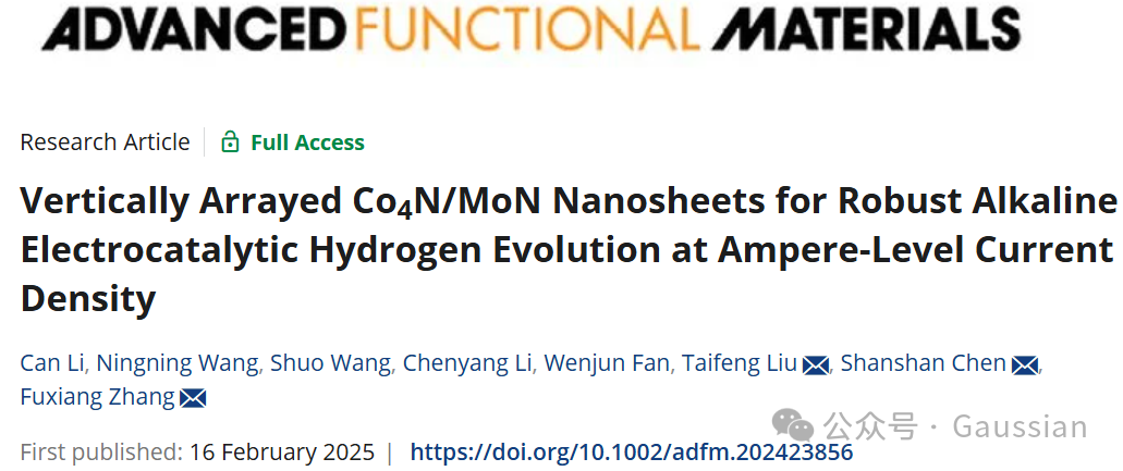 题目:Vertically Arrayed Co4N/MoN Nanosheets for Robust Alkaline Electrocatalytic Hydrogen Evolution at Ampere-Level Current Density