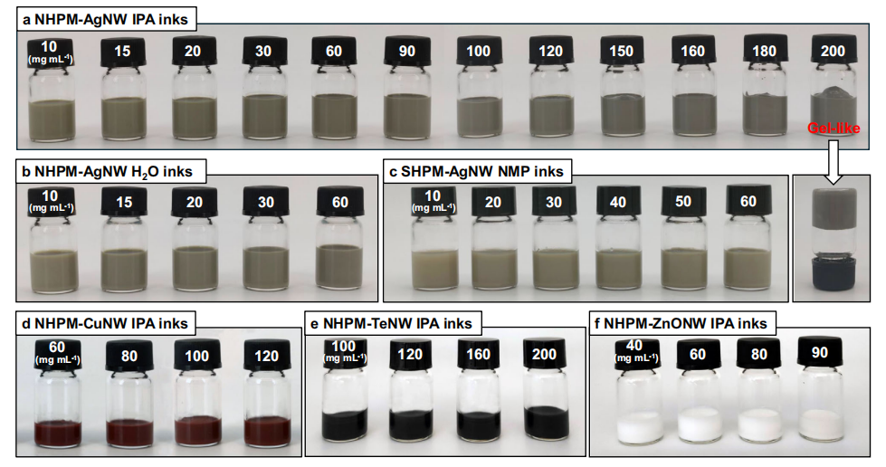 图2主要展示了HPMs-AgNW墨水在不同溶剂及多种纳米线含量下的状态。呈现了NHPM-AgNW在IPA和去离子水、SHPM-AgNW在NMP中不同AgNW含量的墨水照片,其中NHPM-AgNW IPA墨水在AgNW含量约10 - 200mg/mL时稳定,超过150mg/mL会形成凝胶状。同时还展示了NHPM稳定的CuNW、TeNW和ZnONW在IPA中的墨水照片,这些不同纳米线墨水都能在低含量NHPM(与纳米线重量比0.001:1)作分散剂的情况下,制备出固含量高达约20wt.%的稳定触变墨水,且可储存超一个月无明显沉淀,说明HPMs稳定配方策略对多种功能纳米线具有通用性,适用于不同印刷方法 。