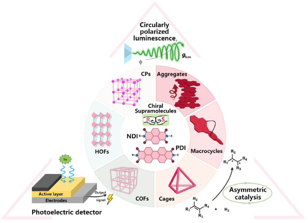 背景:手性超分子结构在光学、电子学和生物医学领域具有广泛应用前景。NDI和PDI因其优异的光电性能和可调控的手性特性,成为构建手性超分子结构的理想材料。