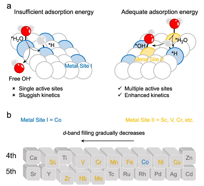 图1:碱性介质中HER Volmer步骤的H2O解离过程示意