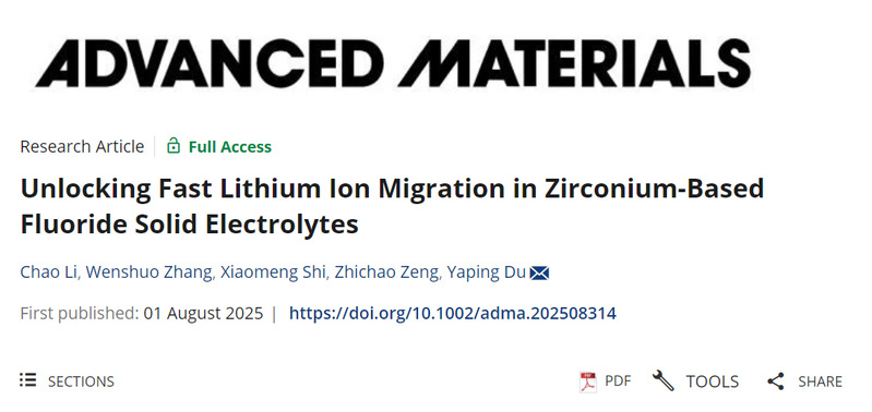 2025年8月1日,南开大学杜亚平(国家杰青)团队在Advanced Materials期刊发表题为“Unlocking Fast Lithium Ion Migration in Zirconium-Based Fluoride Solid Electrolytes”的研究论文,团队成员李超为论文第一作者,杜亚平为论文通讯作者。