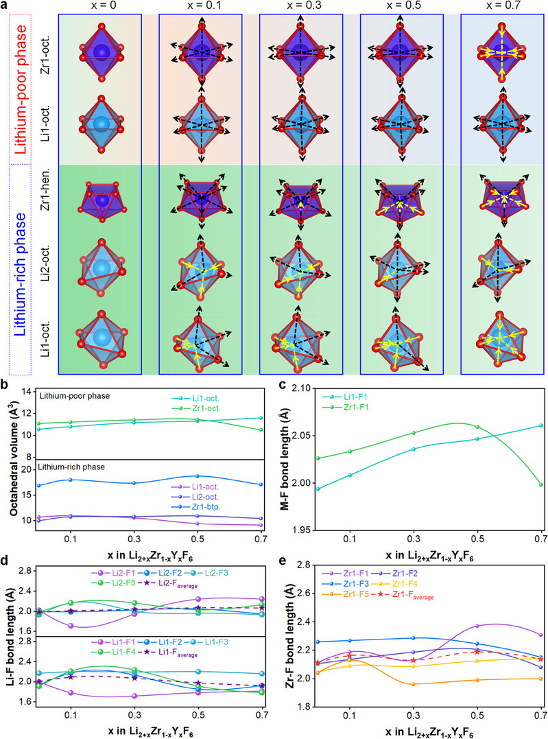 图5. Li₂₊ₓZr₁₋ₓYₓF₆的晶体结构。a) 贫锂相Li₂ZrF₆中Li₁和Zr₁中心的多面体及富锂相Li₄ZrF₈中Li₁、Li₂和Zr₁中心的多面体。箭头表示多面体畸变方向。b) 贫锂相Li₂ZrF₆中Li₁和Zr₁中心多面体的体积及富锂相Li₄ZrF₈中Li₁、Li₂和Zr₁中心多面体的体积。c) 贫锂相Li₂ZrF₆中的Li-F和Zr-F键长。d) 富锂相Li₄ZrF₈中的Li-F键长。e) 富锂相Li₄ZrF₈中的Zr-F键长。