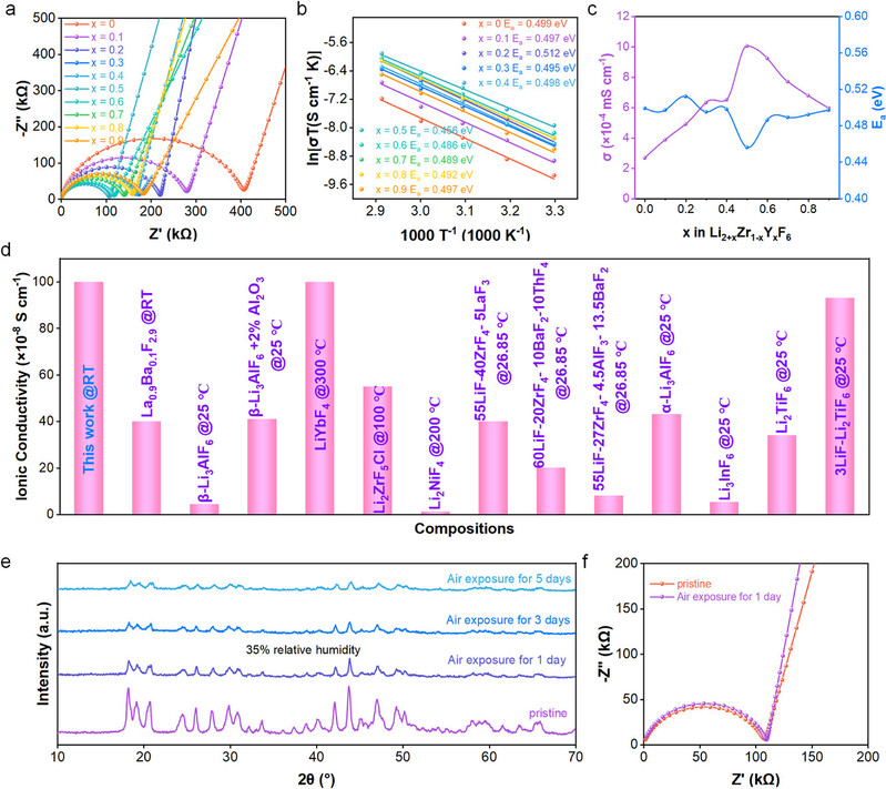 图2. Li₂₊ₓZr₁₋ₓYₓF₆ SSEs的电化学表征。a) C/Li₂₊ₓZr₁₋ₓYₓF₆/C电池的EIS结果。b) 基于C/Li₂₊ₓZr₁₋ₓYₓF₆/C电池的阿伦尼乌斯曲线。c) 室温离子电导率和活化能。d) LZF-0.5与其他报道的氟化物SSEs的离子电导率对比。e) LZF-0.5在相对湿度35%的空气中暴露不同时间前后的XRD图谱。f) LZF-0.5在相对湿度35%的空气中暴露24小时前后的奈奎斯特图。