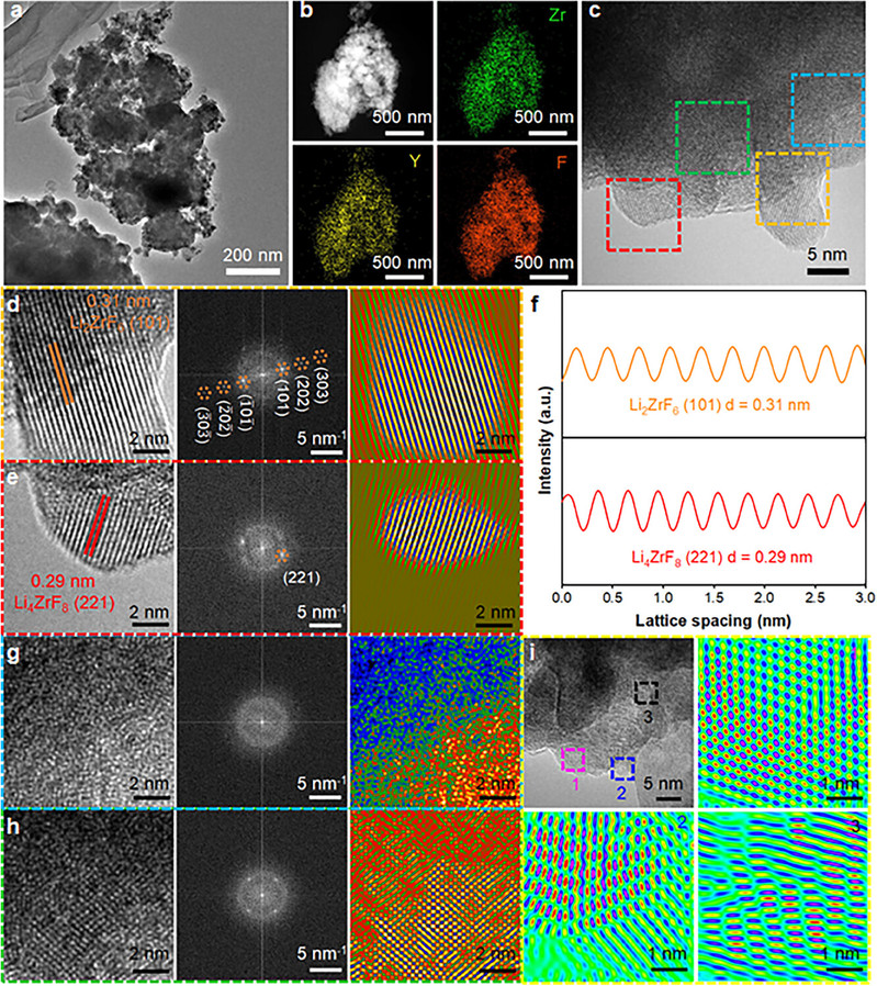 图6. LZF-0.5的微观形貌与缺陷表征。a) TEM图像及b) EDS元素分布图。c) HRTEM图像。d) 黄色区域Li₂ZrF₆的HRTEM图像、FFT及逆FFT图谱。e) 红色区域Li₄ZrF₈的HRTEM图像、FFT及逆FFT图谱。f) Li₂ZrF₆和Li₄ZrF₈的强度分布曲线。g) 非晶基质的HRTEM图像、FFT及逆FFT图谱。h) 位错的HRTEM图像、FFT及逆FFT图谱。i) 纳米尺度区域的HRTEM图像,显示位错(区域1)、扭曲(区域2)和断裂(区域3)等丰富缺陷。