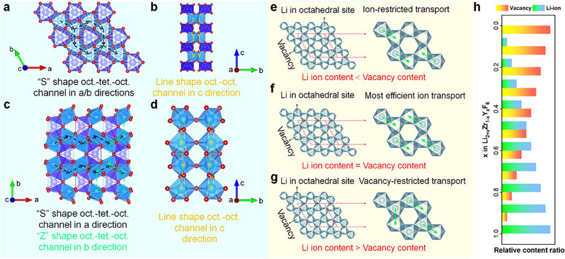 图3. Li₂₊ₓZr₁₋ₓYₓF₆的离子迁移路径分析。a) 贫锂相中沿a/b方向的“S”形八面体-四面体-八面体通道。b) 贫锂相中沿c方向的线性八面体-八面体通道。c) 富锂相中沿a/b方向的“S”形和“Z”形八面体-四面体-八面体通道。d) 富锂相中沿c方向的线性八面体-八面体通道。e) 离子含量低于空位含量的受限传输场景。f) 离子含量与空位含量平衡时的最高效传输场景。g) 离子含量高于空位含量的空位受限传输场景。h) Li₂₊ₓZr₁₋ₓYₓF₆中理论Li⁺浓度与理论空位浓度。