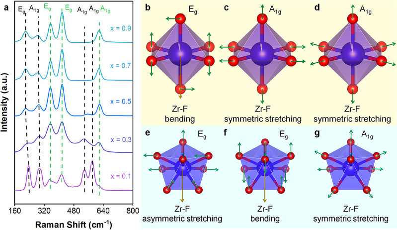 图4. [ZrF₆]²⁻和[ZrF₈]⁴⁻结构单元的振动形式。a) Li₂₊ₓZr₁₋ₓYₓF₆的拉曼光谱。[ZrF₆]²⁻的b) Eg和c,d) A1g拉曼振动模式。[ZrF₈]⁴⁻的e,f) Eg和g) A1g拉曼振动模式。