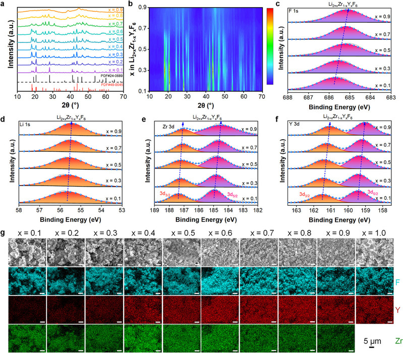 图1. Li₂₊ₓZr₁₋ₓYₓF₆ SSEs的表征。a) Li₂₊ₓZr₁₋ₓYₓF₆的XRD图谱。b) Li₂₊ₓZr₁₋ₓYₓF₆ XRD图谱的等高线图。c) F 1s、d) Li 1s、e) Zr 3d和f) Y 3d的XPS结果。g) Li₂₊ₓZr₁₋ₓYₓF₆的SEM图像及EDS元素分布图。