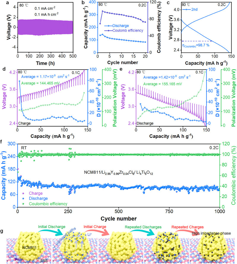 图7. a) Li/LZF-0.5/Li对称电池在80°C、0.1 mA cm⁻²电流密度下的锂沉积/剥离曲线。b) NCM811/LZF-0.5/Li全电池在80°C、0.2C倍率下的循环性能及c) 相应充放电曲线。d) 充电状态和e) 放电状态的GITT曲线及对应极化曲线。f) 以LZF-0.5为正极添加剂的NCM811/Li₂.₉₆Y₀.₉₆Zr₀.₀₄Cl₆/Li₄Ti₅O₁₂全电池在室温、0.2C倍率下的循环性能。g) 氟化物正极添加剂的保护机制示意图。