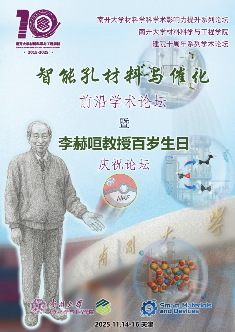 为推动智能材料与催化科学的交叉融合与前沿发展,提升南开大学材料学科和催化学科的影响力,南开大学材料科学与工程学院联合 Smart Materials and Devices 期刊(Science Exploration Press 出版)于 2025 年 11 月 14 – 16 日在天津南开大学津南校区举办“智能孔材料与催化”前沿学术论坛,暨李赫咺教授百岁生日庆祝活动。本次前沿论坛也是南开大学材料科学与工程学院成立十周年系列庆祝活动之一。会议期间也将组办 Smart Materials and Devices 编委会会议。